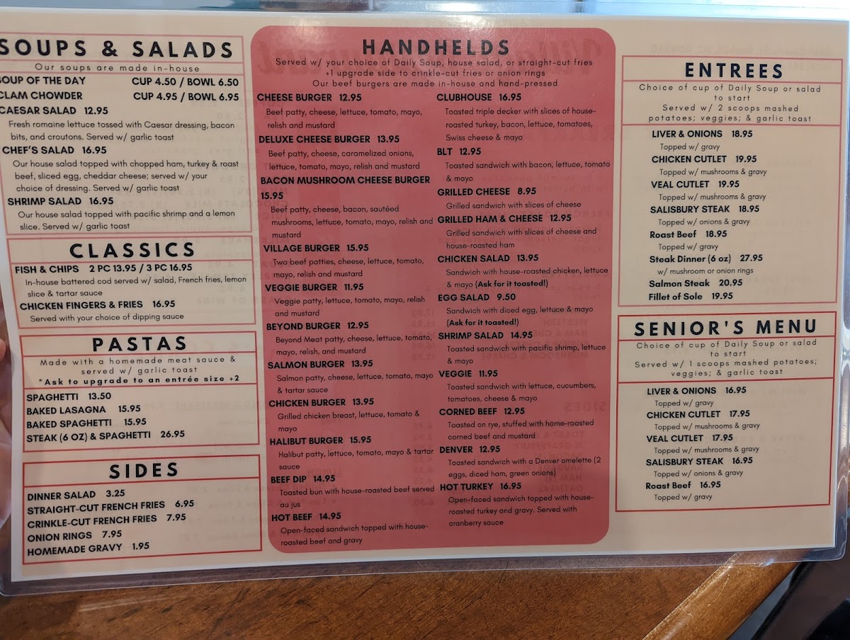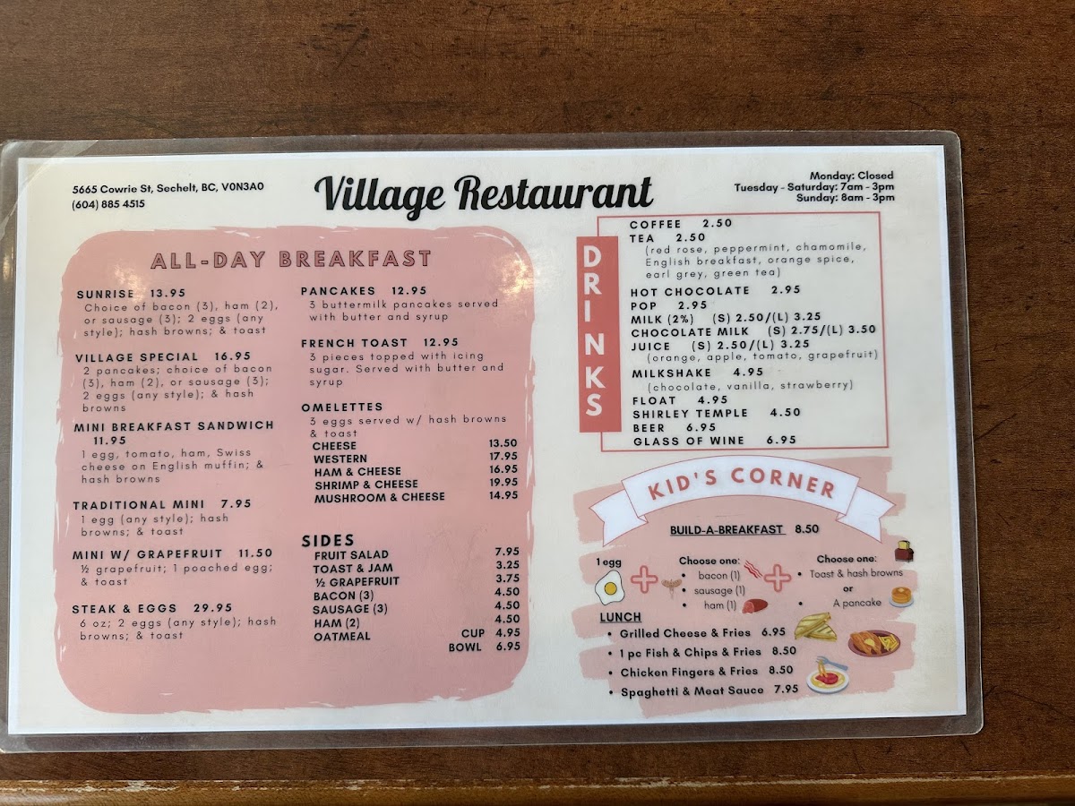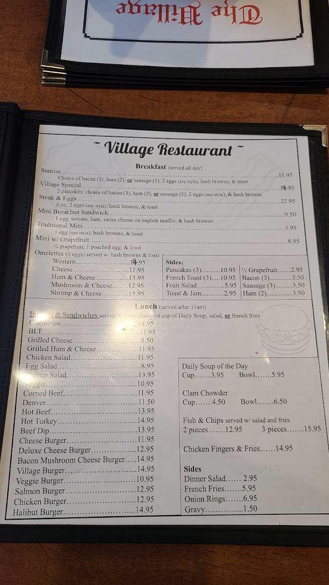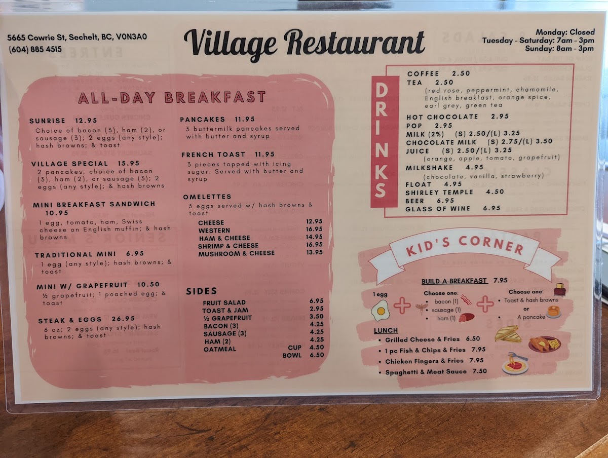 The menu at Village Restaurant in Sechelt offers a wide variety of comforting and hearty dishes suitable for any craving. For breakfast, options like the Sunrise and Village Special cater to those looking for a fulfilling start to their day, with prices likely reflecting the quality and portion size. The Steak & Eggs and Mini Breakfast Sandwich offer more traditional fare, while lighter choices such as the Traditional Mini round out the breakfast selection. The bus and sandwiches section includes familiar favorites like the Grilled Cheese, Grilled Ham & Cheese, and a variety of deli-style options such as Chicken Salad and Egg Salad. If you're in the mood for a side, you can choose from crispy French Fries, Onion Rings, or a fresh Dinner Salad. The soup and salad section boasts comforting options like Clam Chowder and the ever-popular Caesar Salad, alongside heartier options like the Chef's Salad and Shrimp Salad. For those in the mood for something more filling, dishes such as Fish & Chips, Chicken Fingers & Fries, and a variety of pasta options including Baked Lasagna and Baked Spaghetti are available. The Clubhouse, Cheese Burger, and Village Burger are perfect for handheld cravings, while the entrees such as Liver & Onions, Chicken Cutlet, and Roast Beef offer classic comfort meals. The Senior’s Menu mirrors many of these classic dishes, ensuring that everyone can enjoy the favorites. Additionally, the menu features savory Comelettes such as Mushroom & Cheese and Shrimp & Cheese, as well as daily offerings like the Soup of the Day and Clam Chowder. With its diverse offerings, Village Restaurant caters to a wide range of tastes and preferences, making it a perfect choice for any meal of the day.
