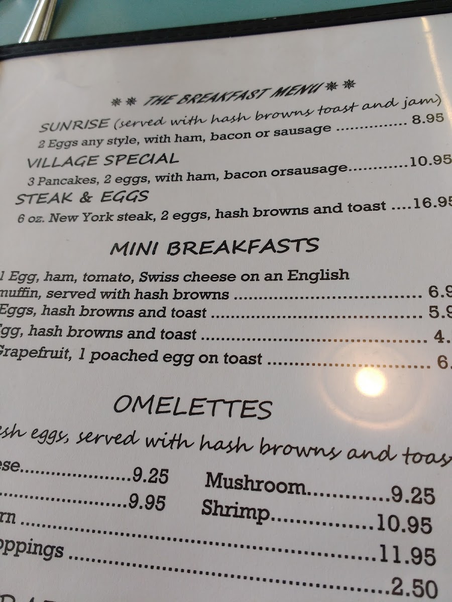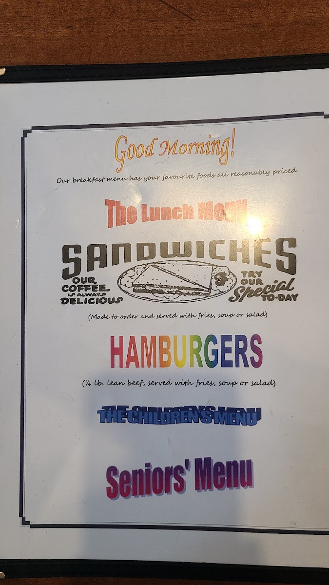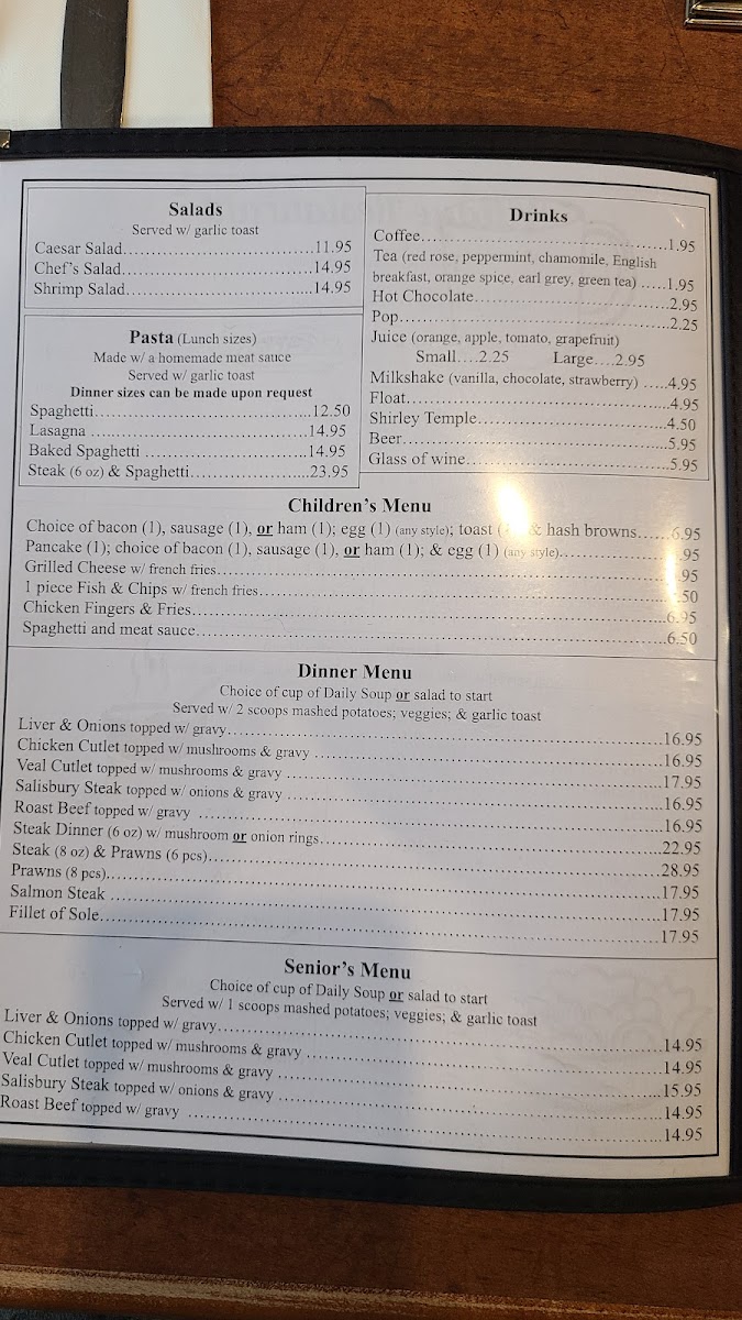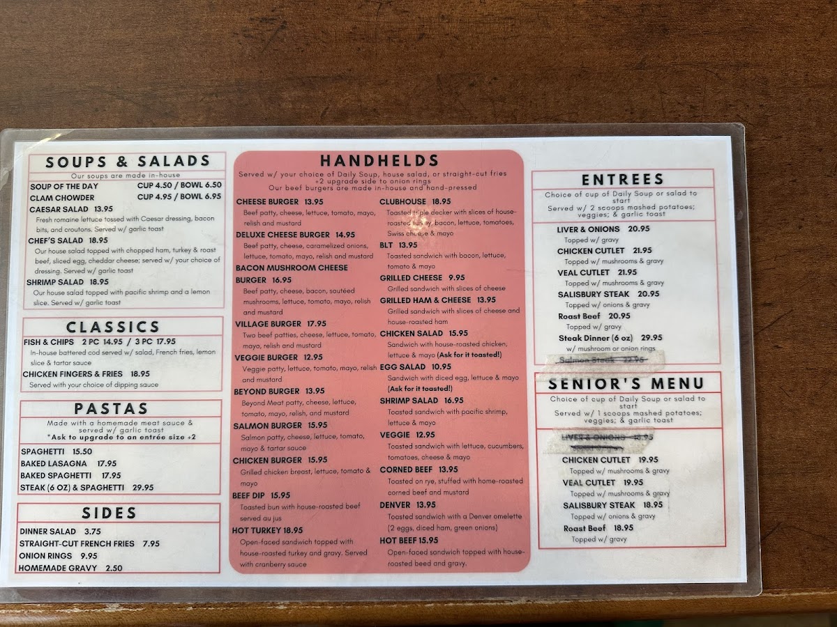 The menu at Village Restaurant in Sechelt offers a wide variety of comforting and hearty dishes suitable for any craving. For breakfast, options like the Sunrise and Village Special cater to those looking for a fulfilling start to their day, with prices likely reflecting the quality and portion size. The Steak & Eggs and Mini Breakfast Sandwich offer more traditional fare, while lighter choices such as the Traditional Mini round out the breakfast selection. The bus and sandwiches section includes familiar favorites like the Grilled Cheese, Grilled Ham & Cheese, and a variety of deli-style options such as Chicken Salad and Egg Salad. If you're in the mood for a side, you can choose from crispy French Fries, Onion Rings, or a fresh Dinner Salad. The soup and salad section boasts comforting options like Clam Chowder and the ever-popular Caesar Salad, alongside heartier options like the Chef's Salad and Shrimp Salad. For those in the mood for something more filling, dishes such as Fish & Chips, Chicken Fingers & Fries, and a variety of pasta options including Baked Lasagna and Baked Spaghetti are available. The Clubhouse, Cheese Burger, and Village Burger are perfect for handheld cravings, while the entrees such as Liver & Onions, Chicken Cutlet, and Roast Beef offer classic comfort meals. The Senior’s Menu mirrors many of these classic dishes, ensuring that everyone can enjoy the favorites. Additionally, the menu features savory Comelettes such as Mushroom & Cheese and Shrimp & Cheese, as well as daily offerings like the Soup of the Day and Clam Chowder. With its diverse offerings, Village Restaurant caters to a wide range of tastes and preferences, making it a perfect choice for any meal of the day.